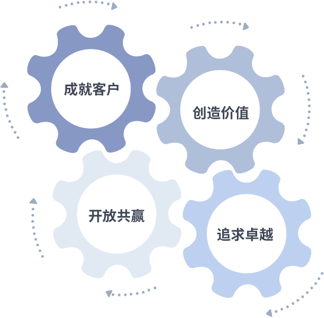 成就客户是一切决策的出发点,,,创造价值是衡量所有工作的标准,,追求卓越是我们做事做人的态度,,,开放共赢是我们的格局也是最终的结果。。。价值观的齿轮环环相扣,,,,推动着组织里的每个人不断向前。。。